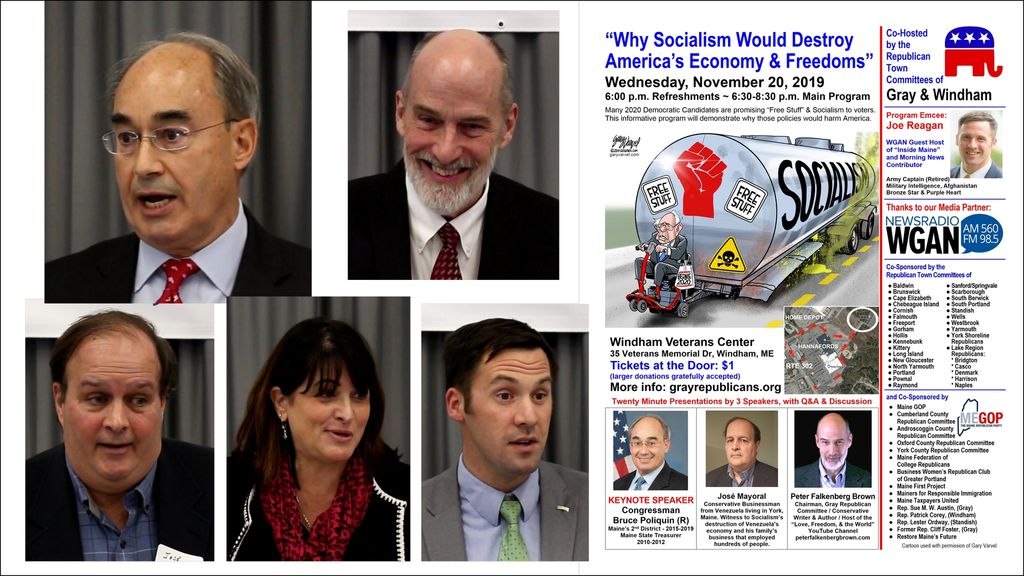 Videos: “Why Socialism Would Destroy America’s Economy & Freedoms”Videos for Event: November 20, 2019, Windham Veterans Center, Windham, Maine Dec 7, 2019 I've uploaded videos for the November 20th event on the dangers of socialism. One "full event" video, and one for each of the five speakers. Congressman Bruce Poliquin, Peter Falkenberg Brown, José Mayoral, Dr. Demi Kouzounas, and Joe Reagan. Here's the url: https://grayrepublicans.org/youtube