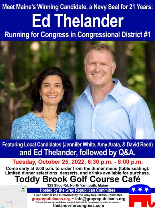Ed Thelander Featuring Local Candidates (Jennifer White, Amy Arata, & David Reed) and Ed Thelander, followed by Q&A. Tuesday, October 25, 2022, 6:30 p.m. - 8:00 p.m. Come early at 6:00 p.m. to order from the dinner menu (table seating). Toddy Brook Golf Course Café Hosted by the Gray Republican Committee Flyer paid for and authorized by the Gray Republican Committee. Contributions to candidates are not deductible for federal or state income tax.