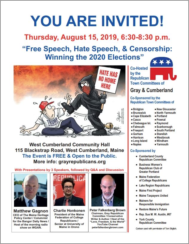 Free Speech, Hate Speech, & Censorship: Winning the 2020 ElectionsEVENT DATE: Thu, Aug 15, 2019, 6:30 p.m. - 8:30 p.m. / West Cumberland Community Hall, 115 Blackstrap Road, West Cumberland, ME / The Event is FREE! Jul 20, 2019 ![]() For questions or more information about this event, please contact Peter Falkenberg Brown, the Chairman of the Gray Republican Committee, at 207-657-1428 or peterbrown@worldcommunity.com. As a conservative have you been censored online or anywhere else? Have you self-censored your words to avoid being called a bigot or hater? Are you worried about what censorship might do to the 2020 elections? If so, you need to attend this very timely and informative program! “Free Speech, Hate Speech, & Censorship: Winning the 2020 Elections”Thu, Aug 15, 2019, 6:30 p.m. - 8:30 p.m. There will be three 20+ minute presentations, followed by Q&A and discussion. The speakers are: