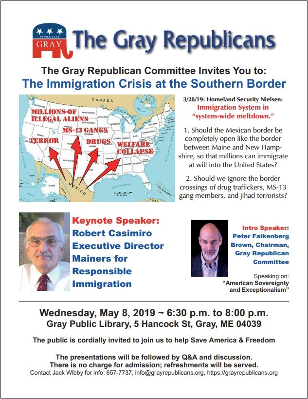 The Gray Republican Committee Invites You to a public speech on: The Immigration Crisis at the Southern Border Wednesday, May 8, 2019 ~ 6:30 p.m. to 8:00 p.m.